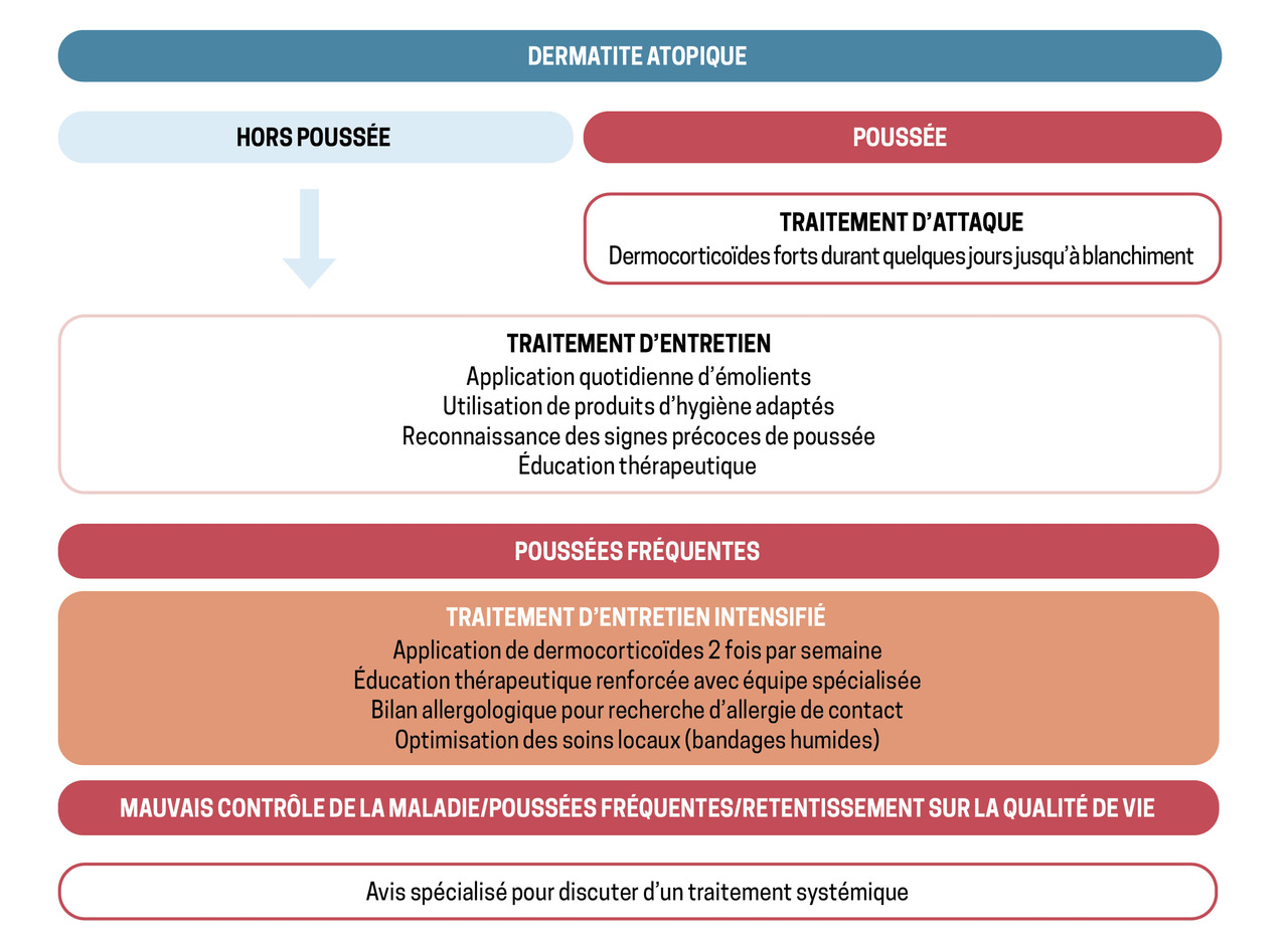 - Le traitement d’attaque à base de dermocorticoïdes doit être instauré dès l’apparition des premiers signes de poussée : érythème et prurit, même sur le visage.