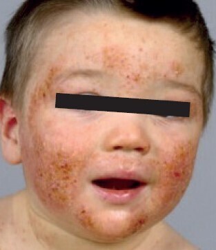 Chez le nourrisson, les lésions débutent souvent au niveau du visage (fig. 3) et du cuir chevelu, puis s’étendent sur les faces d’extension des membres et sur le tronc. Les régions péri-orificielles du visage (nez, sourcils et bouche) ainsi que le siège sont souvent épargnés. Après l’âge de 2 ans, les lésions se localisent plus volontiers au niveau des plis de flexion. On peut observer un double pli sous-palpébral (signe de Dennie-Morgan).