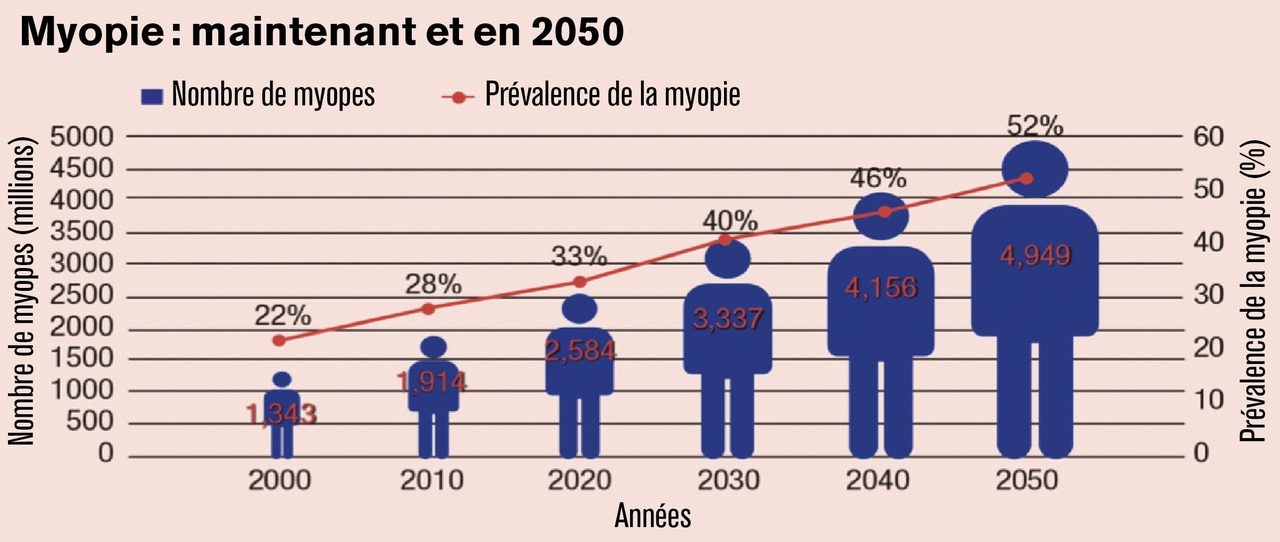 Les générations actuelles sont plus myopes que les générations précédentes et le sont à un âge plus jeune. Des projections du Brien Holden Vision Institute1 estime la prévalence de la myopie en 2050 à 50 % de la population mondiale avec près de 10 % de myopes forts dans le monde (