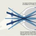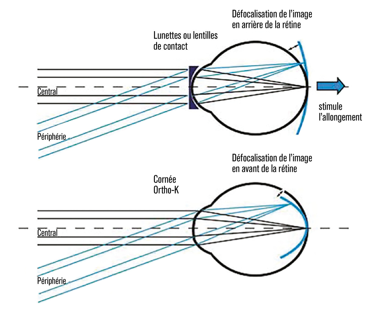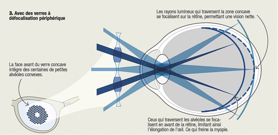 L’adjonction d’une méthode de freination de la myopie adaptée à l’âge de l’enfant est également mise en place. Jusqu’ici, nous corrigions les myopes avec des verres ou lentilles unifocales, ce qui permettait d’amener l’image au niveau du centre de la rétine. En revanche, l’image arrivait nette en arrière de la rétine à la périphérie de l’œil : ce phénomène, appelé défocus hypermétropique rétinien, contribue à stimuler l’élongation de la rétine qui tente en quelque sorte de rattraper l’image nette et génère un signal de croissance de l’œil (