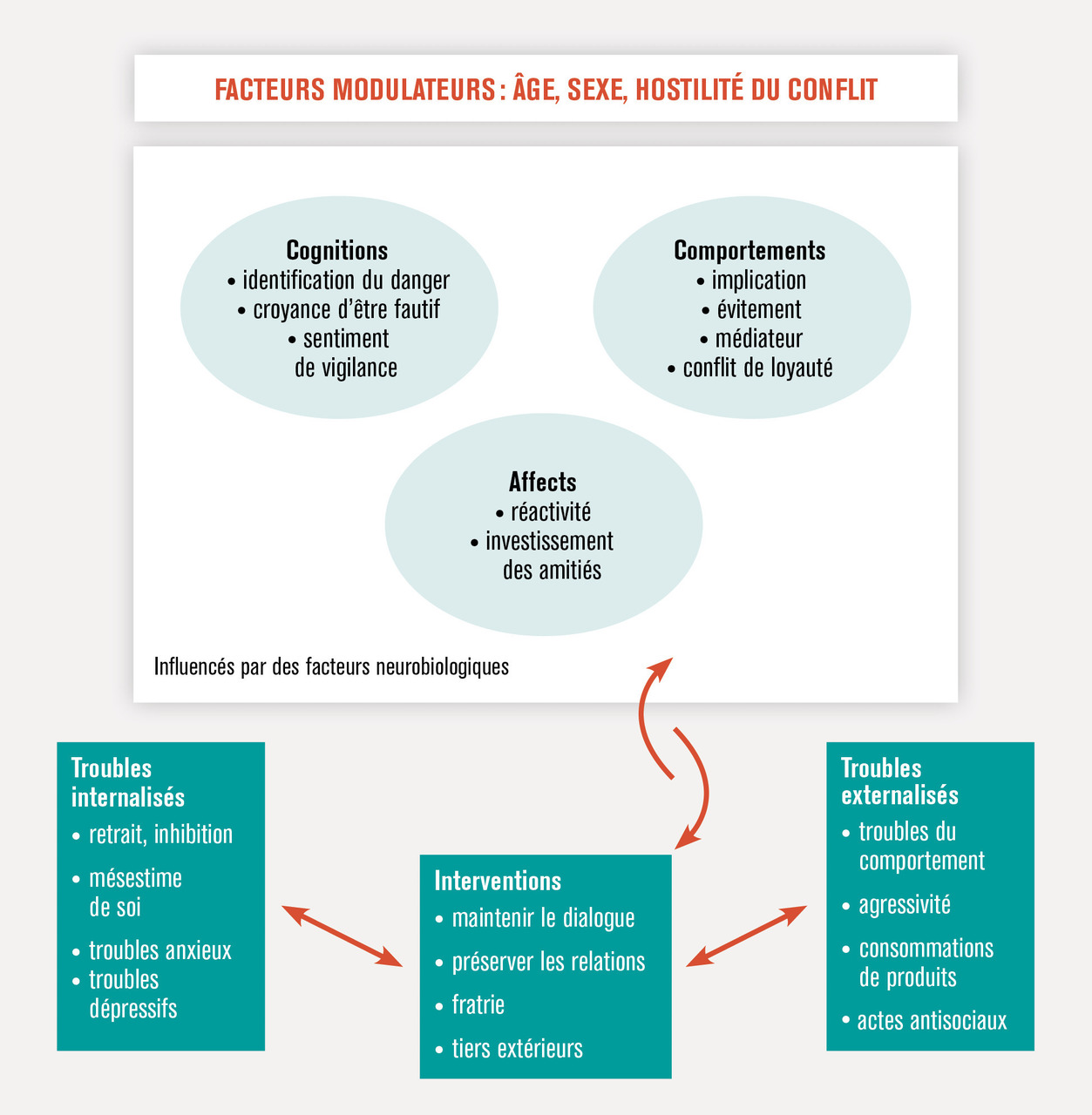 L’âge de l’enfant est un élément de variation des réponses aux conflits. En effet, les enfants en bas âge (< 3 ans) n’ont pas la capacité d’évaluer cognitivement les enjeux du conflit (menace, culpabilité), et développent davantage de troubles du sommeil ou de manifestions somatiques, comme une asthénie, des douleurs abdominales ou un retard de croissance.4 Alors que les enfants plus âgés, souvent exposés depuis plus longtemps, sont à risque de développer plus de manifestions comportementales ou psychiques (hypersensibilité, manifestations dépressives ou passage à l’acte auto- ou hétéro-agressif). De la même manière, les études concordent pour dire que les conflits retentissent autant sur les filles que sur les garçons, mais que l’expression de la souffrance peut être différente. Les garçons interprètent plus le conflit comme une menace pour eux et développent plus de troubles du comportement, alors que les filles perçoivent davantage la menace de l’équilibre familial et ont tendance à vouloir intervenir dans le conflit.4