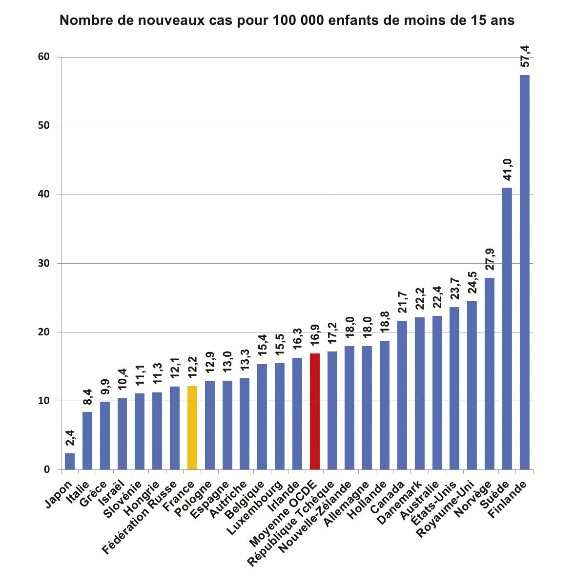En France, des données d’incidence ont pu être estimées à partir de 1988.3, 4 Un registre fondé sur quatre régions (Aquitaine, Lorraine, Haute et Basse-Normandie) a permis l’estimation du taux d’incidence nationale du diabète de type 1 jusqu’en 1997.4 Chez les jeunes de moins de 20 ans, une augmentation d’incidence de 7,4 à 9,6 pour 100 000 jeunes par an a été mesurée entre 1988 et 1997, ce qui correspondait à une augmentation de 4,2 % par an pour le sous-groupe âgé de moins de 15 ans. La plus forte augmentation de l’incidence était observée chez les enfants de moins de 5 ans, avec des taux augmentant de 4,2 à 7,5 pour 100 000 par an entre 1988 et 1997, alors que l’incidence était restée stable chez les jeunes de 15 à 19 ans.4 Puis une seule de ces régions, l’Aquitaine, a maintenu un registre entre 1998 et 2004.5 L’incidence chez les jeunes de moins de 15 ans augmentait régulièrement, pour atteindre 13,5 pour 100 000 en 2004,5 correspondant à une augmentation annuelle de 3,3 %. Entre 1987 et 2004, ces sources étaient les seules à permettre une estimation de l’incidence cumulée du diabète de type 1 chez l’enfant en France : on estimait ainsi qu’il touchait environ 1 jeune de moins de 15 ans sur 1 000 dans les années 2000.