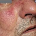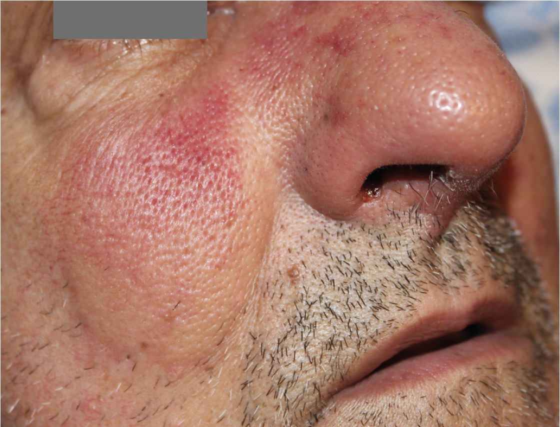 Michel, 74 ans, a un œdème et un érythème sur la joue droite depuis 24 heures, accompagnés de fièvre et de douleurs nasales importantes. L’examen montre une croûte au niveau de la narine droite.