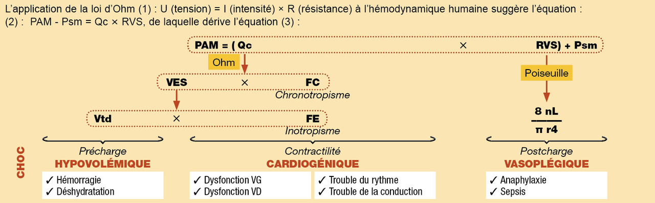 1. Le choc hypovolémique est dû à une diminution du retour veineux (précharge cardiaque) et donc du débit cardiaque, causée par une perte absolue (ex : hémorragie) ou relative (ex : fuite capillaire, troisième secteur) du volume intravasculaire.