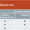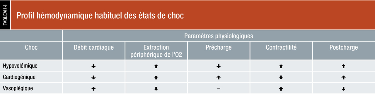 Il est recommandé d’utiliser une approche hémodynamique multiparamétrique pour caractériser l’état de choc (tableau 4). En général, on observe au cours des états de choc un état hypodynamique (la baisse du volume d’éjection systolique et du débit cardiaque est responsable de la diminution du transport artériel en oxygène), à l’exception du choc vasoplégique, qui est caractérisé par un état hyperdynamique (débit cardiaque élevé), le déficit principal se trouvant à la périphérie, avec perte du tonus vasculaire et altération de l’extraction de l’oxygène. Par ailleurs, le choc hypovolémique présente typiquement des indices de précharge bas, à l’inverse du choc cardiogénique où les indices de précharge VD et/ou VG sont élevés.