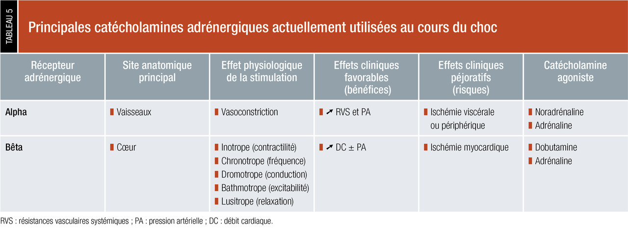 Les agonistes adrénergiques (catécholamines) sont utilisés en première intention car ils sont puissants et rapides, avec une demi-vie courte. La stimulation de chaque type de récepteur adrénergique a des effets potentiellement bénéfiques et néfastes (tableau 5) :- la noradrénaline est le vasopresseur de choix pour maintenir la pression artérielle ; elle possède principalement des propriétés alpha-adrénergiques, avec des effets b-adrénergiques modestes ;