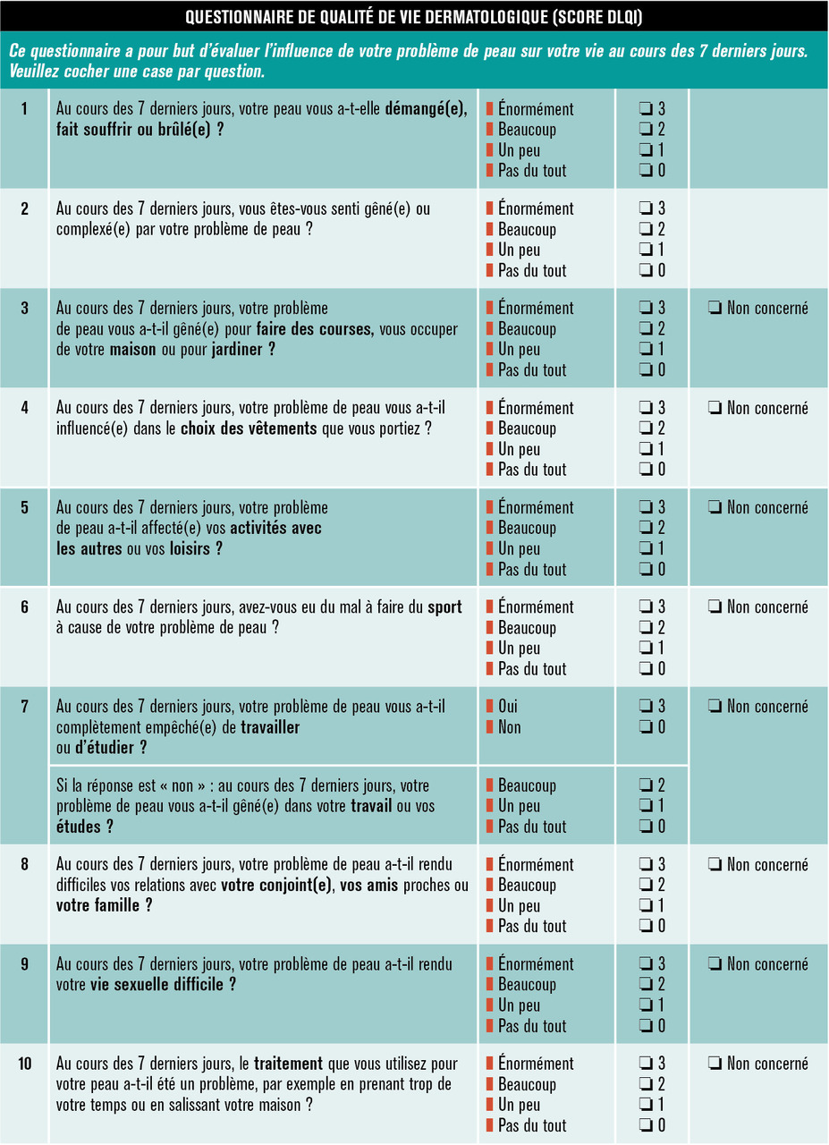 Le DLQI est un autoquestionnaire de qualité de vie standardisé et validé, rempli par le patient, idéalement sans influence du médecin, avant la consultation et mesurant l’impact de la dermatose lors des 7 jours précédents (tableau 3).