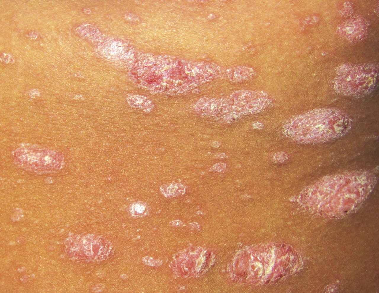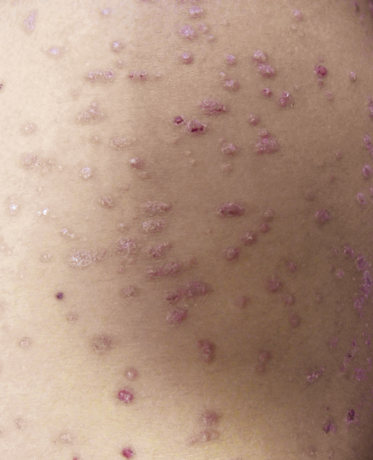 Le psoriasis ne pose en général pas de problème diagnostique, les plaques étant le plus souvent typiques, érythémato-squameuses, bien limitées, siégeant préférentiellement sur les zones « bastion » que sont les coudes et les genoux, le cuir chevelu, l’ombilic et les ongles.