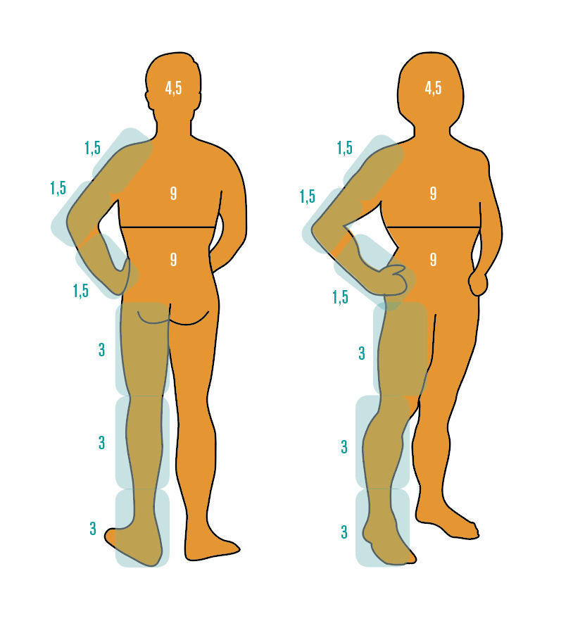 Sans préjuger de l’intensité ni de l’épaisseur des plaques, ce score permet de mesurer le psoriasis comme d’autres dermatoses, en fonction de la surface cutanée atteinte (v. figure) selon la règle habituelle des 9.
