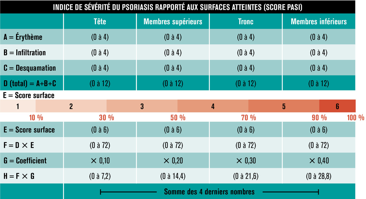 Ce score composite mesure successivement sur quatre zones du corps (tête, membres supérieurs, tronc et membres inférieurs) les trois caractéristiques des lésions : l’érythème, l’épaisseur de la plaque (infiltration) et la desquamation (tableau 2).