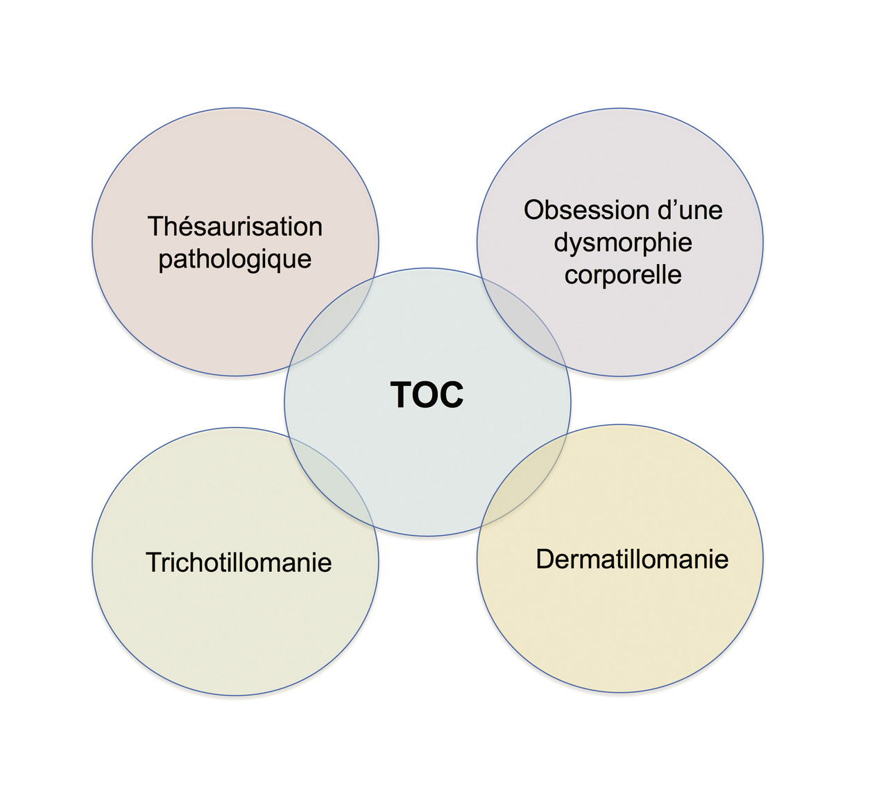 Si l’anxiété est toujours un symptôme clairement rapporté par les patients atteints de TOC, le DSM-5 a créé une nouvelle catégorie rassemblant les TOC avec des troubles qui lui sont « apparentés » (fig. 2 ).3