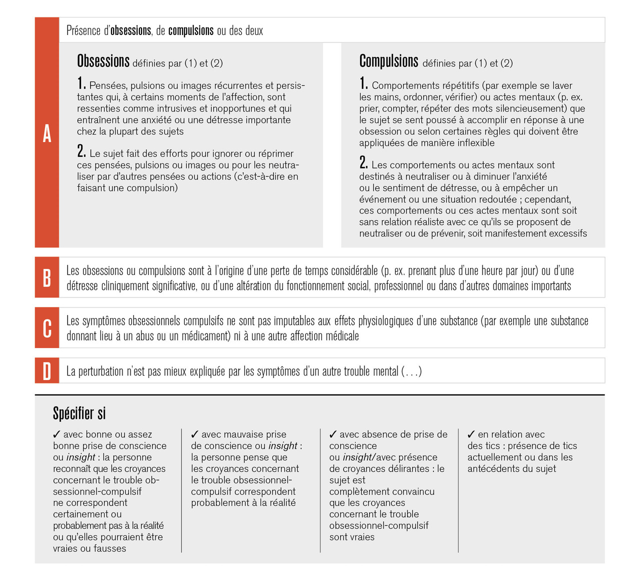 Ainsi, cette nouvelle version du DSM-5 demande de confirmer si les symptômes observés sont bien ceux d’un TOC, et de préciser le degré d’insight et la présence de tics associés.