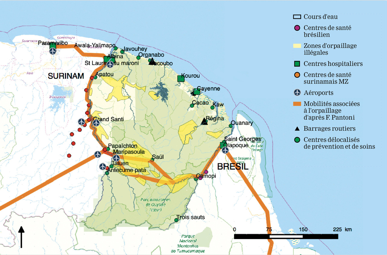 Les zones frontalières sont par ailleurs des zones de ravitaillement et de repos pour les orpailleurs illégaux mais aussi, sur le littoral, des zones de transit de stupéfiants. Elles constituent des zones de vulnérabilité sociale et sanitaire et représentent un réel challenge pour les institutions et les professionnels de santé.