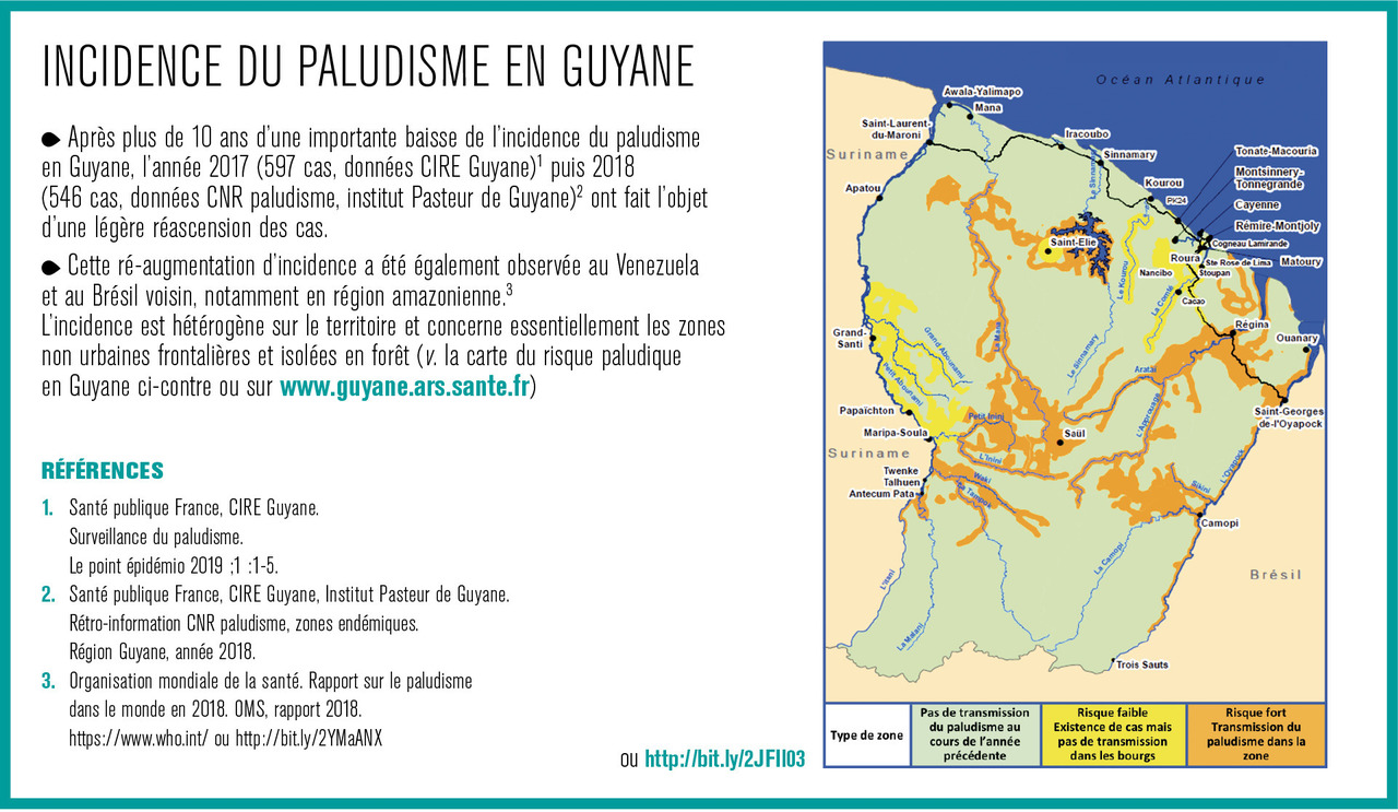 Les orpailleurs participent à l’exportation de cas de paludisme acquis en Guyane et diagnostiqués, pris en charge et signalés par les centres de soins frontaliers surinamais et brésiliens.14, 15 De fait, cette communauté participe activement à la dynamique de l’épidémie de paludisme en Guyane (v . encadré ) mais limite également les efforts de pré-élimination par les États frontaliers.14, 16 Diminuer le nombre de cas de paludisme chez les orpailleurs illégaux constitue donc un des points stratégiques clés pour limiter le nombre de cas dans la région amazonienne.6, 7, 14, 16