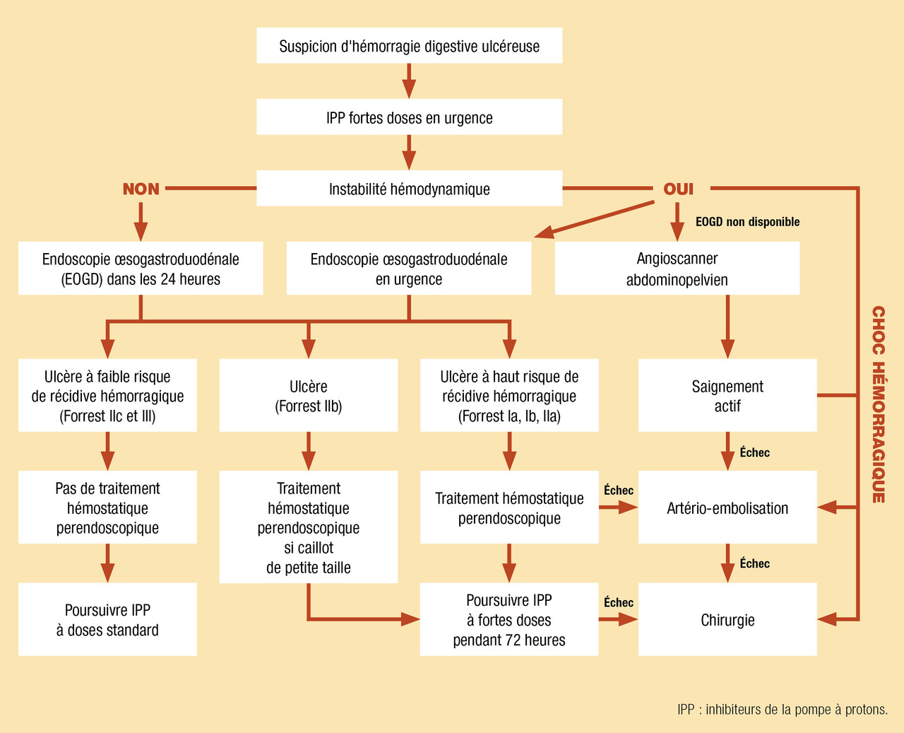 Un traitement par inhibiteurs de la pompe à protons (IPP) intraveineux à « fortes » doses (bolus de 80 mg, puis 8 mg/h, IVSE) doit être initié sans attendre la confirmation endoscopique du diagnostic de maladie ulcéreuse. Il est poursuivi à ces doses élevées, et le patient maintenu à jeun pendant 72 heures dans la grande majorité des cas. En cas d’ulcère à faible risque de récidive (Forrest III et IIc), le traitement peut cependant être poursuivi à dose « standard » dès la fin de l’endoscopie et l’alimentation réintroduite précocement.