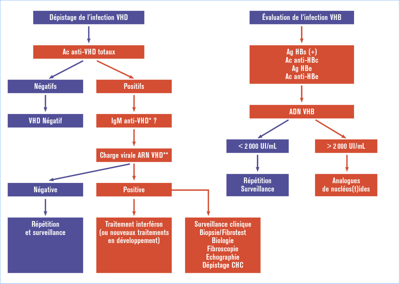 La recherche des ARN Delta, et surtout la quantification de la charge virale ARN par reverse transcription polymerase chain reaction (RT-PCR) en temps réel, est le maître examen pour le diagnostic et la prise en charge des patients. Il permet de confirmer le caractère réplicatif de l’infection mais aussi de mesurer l’efficacité du traitement institué. Cependant, si un étalon VHD standard inter- national (Organisation mondiale de la santé) est disponible depuis 2013, peu de kits commerciaux permettent de quantifier de façon satisfaisante les souches virales du fait de la grande variabilité génétique des virus. En effet, des contrôles de qualité nationaux et internationaux organisés par le Centre national de référence (CNR) des hépatites B, C et Delta ont montré que la plupart des tests commerciaux et des techniques « maison » développés par comparaison aux résultats obtenus par la méthode consensus de référence développée par le CNR étaient incapables de quantifier ou sous-estimaient de façon très importante la charge virale chez des patients infectés par des souches africaines de génotypes 1, 5, 6, 7 et 8.4Les différents essais thérapeutiques de phase II en cours avec de nouvelles molécules anti-VHD, tels les inhibiteurs d’entrée du virus et les inhibiteurs de prénylation, ainsi que les polymères d’acides nucléiques ont démontré l’intérêt majeur de cet outil diagnostique.Le génotypage de la souche Delta infectante réalisé par séquençage nucléotidique et analyse phylogénétique2 n’a d’intérêt pour l’instant qu’en recherche appliquée. Des données personnelles récentes, à confirmer, montreraient une évolution plus grave de la maladie liée aux génotypes VHD-1 et VHD-5 (Roulot D. et Gordien E.). La charge virale du VHB est aussi un élément important du suivi des patients. Elle est souvent inhibée lors de la réplication du VHD et un rebond peut être observé sous traitement anti-VHD efficace. La quantification de l’ADN VHB permet aussi au clinicien de faire les choix thérapeutiques initiaux par analogues de nucléos(t)ides et/ou interféron alpha pégylé (et/ou nouveaux médicaments anti-VHD), en cas de réplication concomitante des deux virus ou de la prédominance de l’un d’eux. Enfin, plus récemment, plusieurs équipes ont montré l’intérêt de la cinétique de quantification de l’antigène HBs dans le suivi des patients infectés. Sa diminution, quoique très longue à être objectivée, serait un marqueur pronostique favorable de la résolution de l’infection VHB-VHD. En revanche, l’intérêt dans l’infection par le VHD des nouveaux marqueurs de l’infection par le VHB, tels les antigènes de capside et l’ARN VHB circulant, reste encore à évaluer.En conclusion, tous les patients infectés par le VHB doivent bénéficier du dépistage du VHD, car celui-ci est responsable d’une évolution péjorative de la maladie hépatique avec accélération de la fibrose, de la cirrhose et du carcinome hépatocellulaire. Seul un traitement long (au moins 48 semaines) par l’interféron alpha pégylé peut permettre d’espérer une guérison de l’infection chronique Delta chez cependant seulement 25 à 40 % des patients. Aussi, seuls la vaccination anti-VHB en amont et l’avènement de traitements anti-VHB efficaces dans le cadre des programmes nationaux et internationaux « HBV cure », couplés à des traitements anti-VHD spécifiques, permettront la prévention et l’éradication de l’infection VHB et du VHD, son virus satellite.