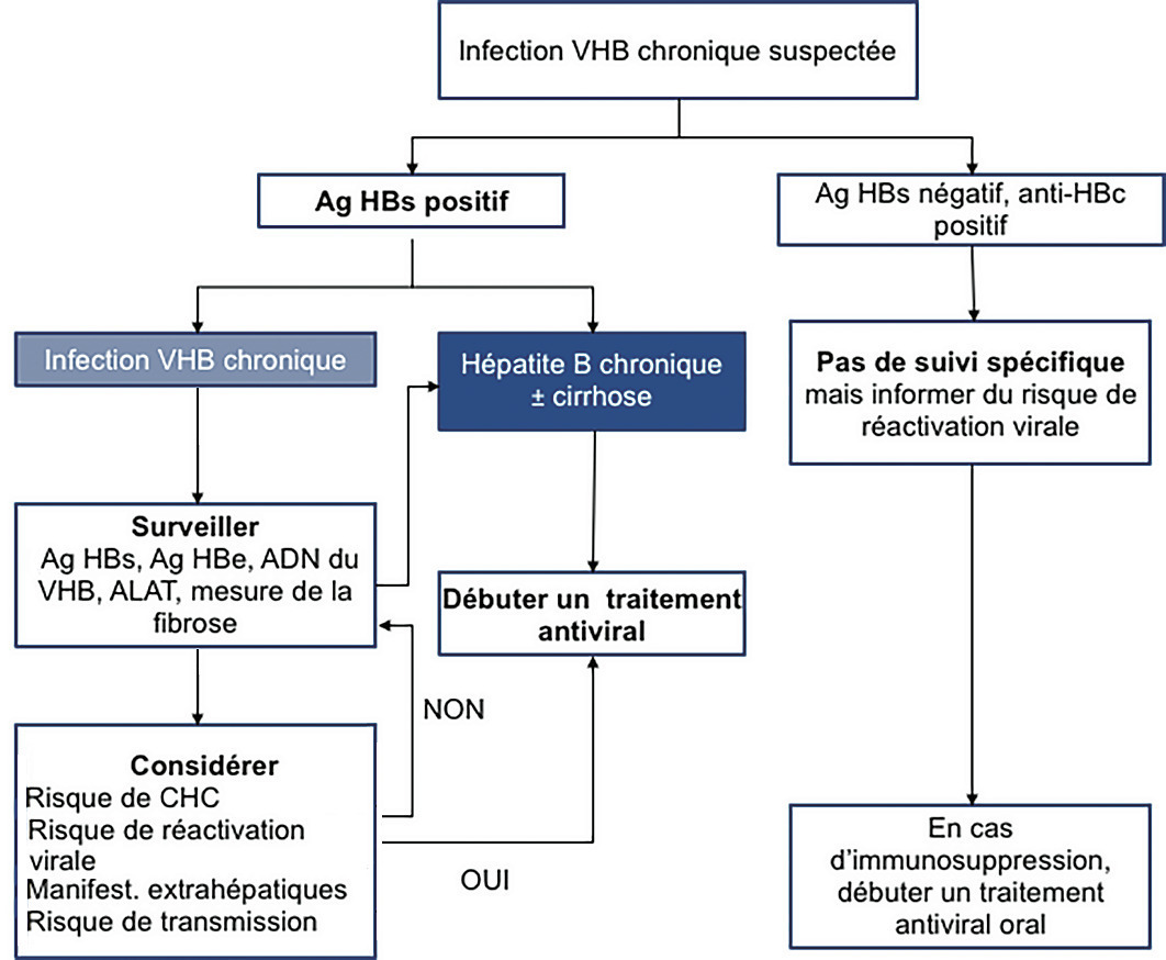 Selon les recommandations, tout patient ayant une infection virale B devant être traitée doit recevoir un antiviral au long cours (éventuellement à vie) efficace et à barrière génétique élevée (faible taux de résistance), c’est-à-dire (depuis 2015, et selon la disponibilité des médicaments dans les pays) principalement l’entécavir ou le ténofovir.