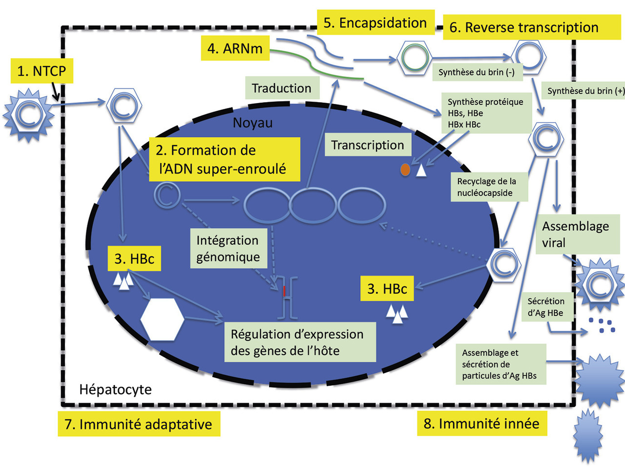 Cette dernière migre vers le noyau et l’ADN du VHB y pénètre. Par un mécanisme encore mal connu, l’ADN asymétrique ouvert (le brin court du génome viral), présent dans la particule, devient double brin circulaire fermé dans le noyau. Cet ADNccc (covalently closed circular DNA), ou ADN superenroulé, s’associe à des histones cellulaires pour former un minichromosome : c’est la forme de persistance du VHB dans les hépatocytes.