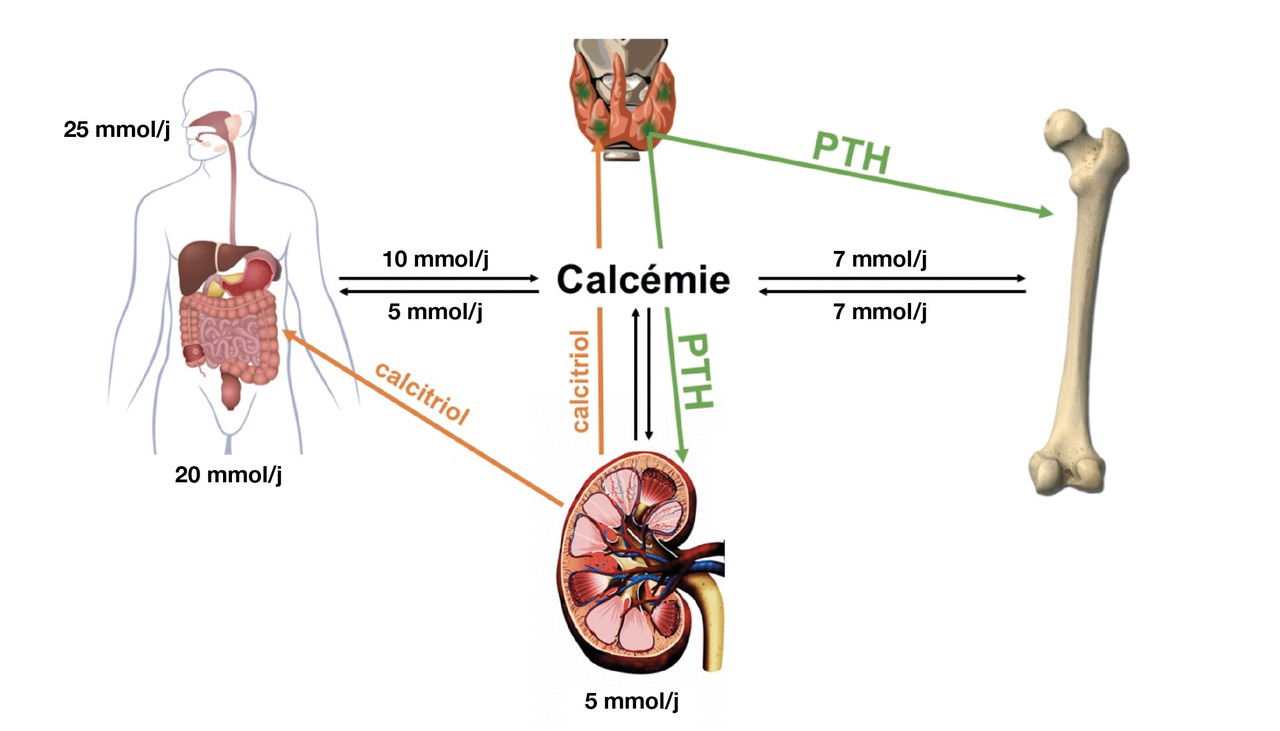 La concentration extracellulaire de calcium libre (dit « ionisé ») est captée en continu par le récepteur membranaire sensible au calcium (CaSR), présent à la surface des cellules parathyroïdiennes. Lors d’une diminution (même infime) de la calcémie, les cellules libèrent plus de PTH dans la circulation ; et inversement, lors d’une augmentation (même infime) de la calcémie. La PTH agit directement sur le rein, via son récepteur PTHR1, en augmentant l’hydroxylation de la vitamine D (tubule proximal) en calcitriol, en augmentant la réabsorption de calcium (anse de Henle et tube contourné distal) et en diminuant celle de phosphate (tubule proximal). Le calcitriol agit, d’une part, sur le tube digestif où il augmente l’absorption à la fois de calcium et de phosphate et, d’autre part, sur le rein, où il potentialise les effets rénaux de la PTH. Par ailleurs, le calcitriol exerce un rétrocontrôle négatif sur la sécrétion (et la synthèse) de PTH au niveau des glandes parathyroïdes. Sur l’os, la PTH stimule le remodelage (l’ostéoformation et l’ostéorésorption). À l’âge adulte, la balance nette osseuse est normalement nulle : l’os libère autant de calcium qu’il n’en capte. À l’état stable, la calciurie reflète les entrées de calcium dans ce système, principalement digestives.