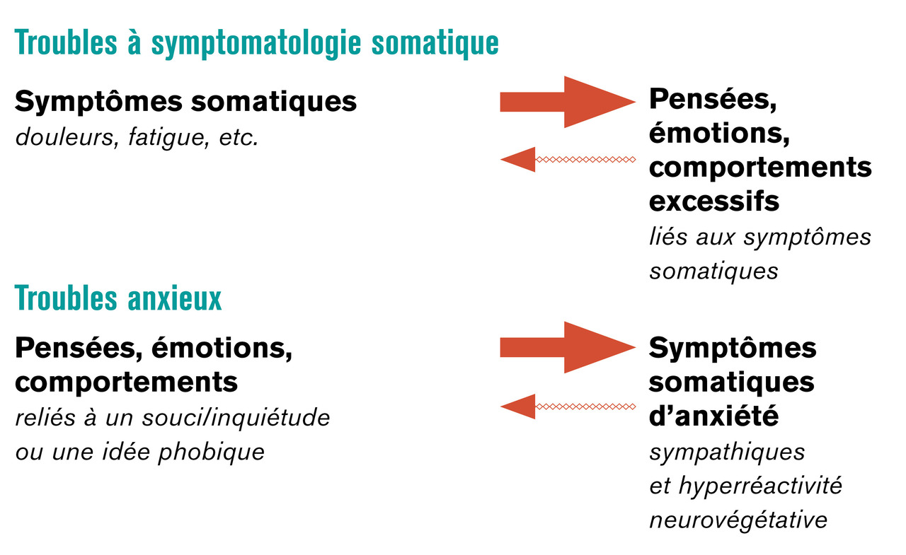 En effet, les troubles à expressions somatiques sont des troubles qui comportent au premier plan du tableau clinique des symptômes somatiques (comme la douleur ou autres) associés à des pensées, des émotions, des comportements liés à ces symptômes somatiques. À l’inverse, les troubles anxieux peuvent être associés à des symptômes somatiques d’anxiété (signes sympathiques comme palpitation, tachycardie, tachypnée, vertige, paresthésie, hypersudation, etc. et signes d’hyperréactivité neurovégétative), mais les symptômes au premier plan sont des pensées, des émotions, des comportements en lien avec le souci/inquiétude/préoccupation ou l’idée phobique spécifique.