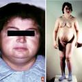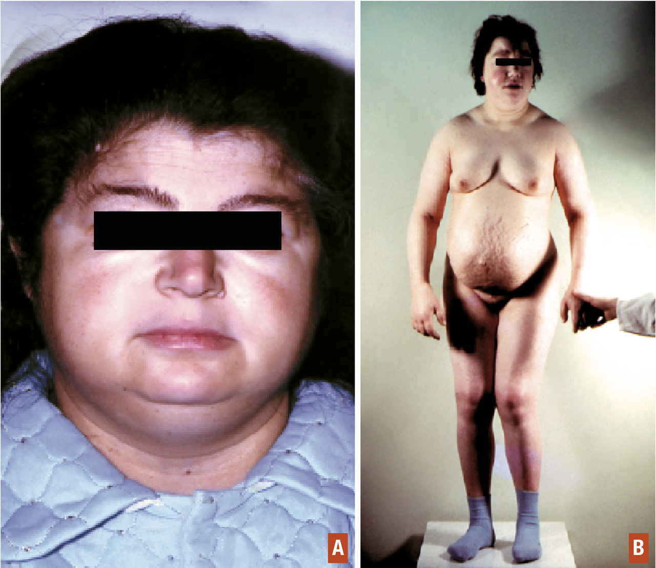 Le myxœdème résulte de l’infiltration de la peau et des tissus sous-cutanés par une substance mucoïde, riche en polysaccharides acides (figure A et B). Il s’agit d’un faux œdème ferme, ne prenant pas le godet. Il affecte le visage qui s’arrondit, les traits sont épaissis, les lèvres soufflées, les paupières bouffies. Le tronc est infiltré avec un comblement des creux sus-claviculaires, les jambes sont élargies en « poteaux », les extrémités (mains et pieds) sont boudinées. La peau est froide et sèche, d’une pâleur cireuse hormis au niveau des lèvres et des pommettes volontiers érythrocyanosiques. L’infiltration muqueuse et musculaire est à l’origine de la macroglossie, de la voix rauque et grave, de l’hypoacousie, du ronflement et des apnées lors du sommeil. Les phanères sont touchés : les cheveux sont secs et cassants, se raréfient, de même que la pilosité axillaire, pubienne et la queue des sourcils. Les ongles sont striés et fragiles. Le myxœdème est à l’origine d’une prise de poids modérée qui contraste avec la réduction de l’appétit (l’hypothyroïdie n’est pas cause d’obésité).