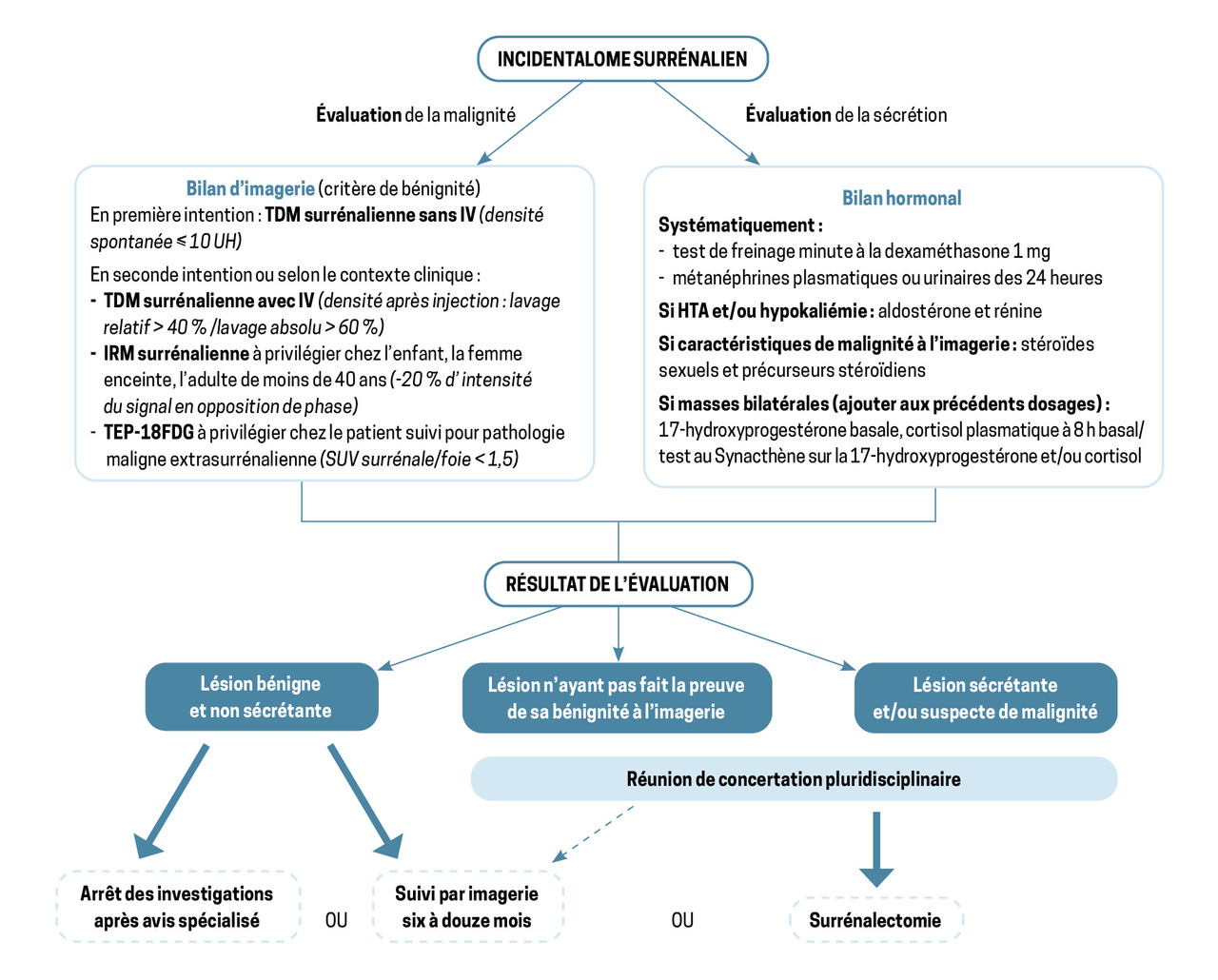 Une évaluation urgente des incidentalomes surrénaliens doit être réalisée chez les enfants, les adolescents, les femmes enceintes et les adultes de moins de 40 ans, en raison d’une probabilité plus élevée de malignité. L’IRM est à privilégier en première intention, avec indication de résection chirurgicale si la masse est indéterminée. En revanche, chez des sujets fragiles, la prise en charge doit être adaptée au gain clinique potentiel.
