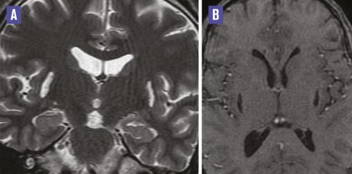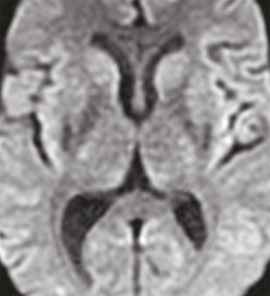 Cet homme de 36 ans, alcoolique chronique, était admis au service d’ophtalmologie pour l’exploration d’une cécité bilatérale. L’imagerie par résonance magnétique (IRM) orbito-encéphalique, demandée dans le cadre du bilan causal, montrait une atteinte putaminale bilatérale et symétrique de signal liquidien ; hyperintense en T2 (fig. 1A ), hypo-intense en T1 et Flair, sans restriction de la diffusion (fig. 2 ) ni rehaussement sur les séquences injectées (fig. 1B ) en rapport avec une nécrose de liquéfaction de type pseudokystique putaminal. Les voies optiques et la substance blanche sous-corticale étaient sans anomalie. Le diagnostic d’une intoxication au méthanol était confirmé par un taux sanguin élevé de méthanol.