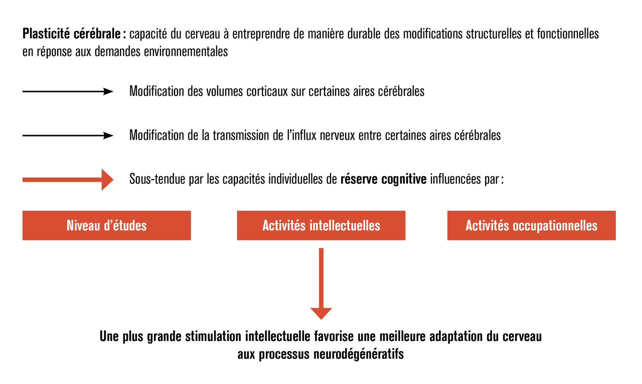 Dans la maladie d’Alzheimer, les objectifs de la stimulation cognitive sont de ralentir le déclin cognitif global ainsi que la perte d’autonomie dans les activités de la vie quotidienne, mais aussi de maintenir des relations sociales satisfaisantes. Ce travail, fondé sur les mécanismes de plasticité cérébrale3 (fig. 1 ) peut se faire par : le soutien des fonctions fragilisées, l’entretien des fonctions préservées, mais aussi la mise en place de stratégies compensatoires dans les différents activités (quotidiennes, de loisirs et de travail), en s’adaptant à la sévérité de l’atteinte cognitive.
