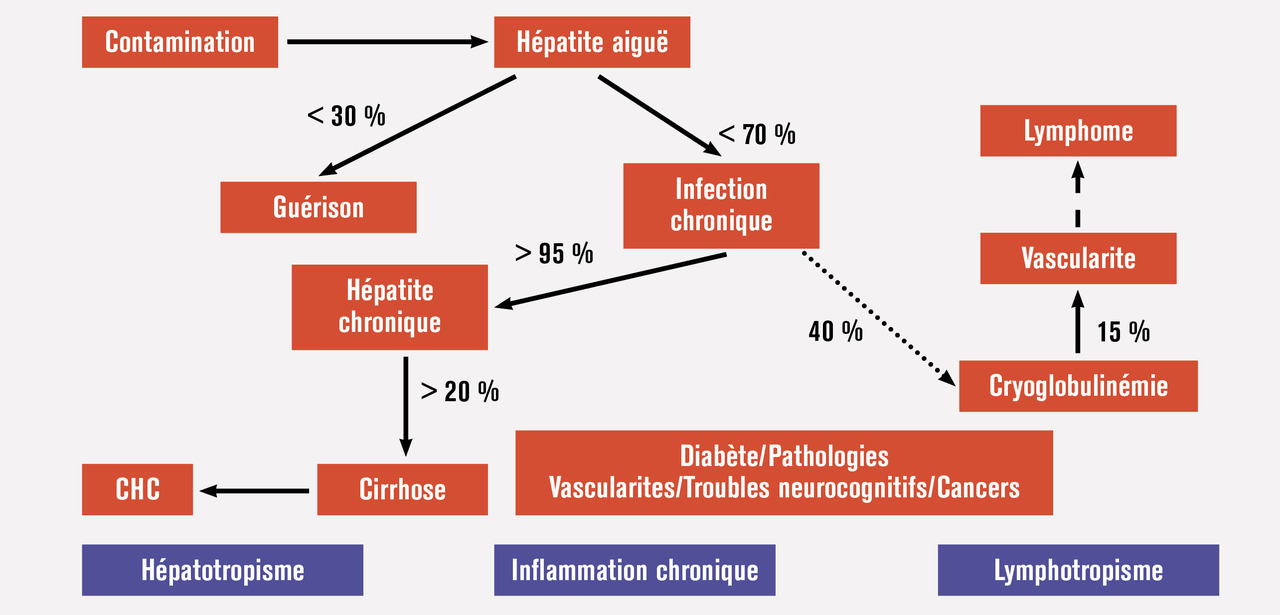 L’histoire naturelle de l’infection virale C est caractérisée par une hépatite aiguë survenant 5 à 45 jours après la contamination : si l’hypertransaminasémie est constante, l’ictère ne sera présent que dans 20 % des cas. Il n’y a pas de forme fulminante de l’hépatite aiguë, dont le taux de guérison spontanée est de l’ordre d’un tiers : l’évolution vers la chronicité est donc observée dans 60 à 80 % des cas. Les patients ayant eu une hépatite aiguë C résolutive (anti-VHC+ et ARN VHC négatif par RT-PCR) sont guéris : aucune prise en charge diagnostique ou thérapeutique n’est nécessaire, mais ils ne sont pas protégés du risque de réinfection en cas de réexposi- tion (transfusions itératives des hémoglobinopathies dans les années 1970-1980, par exemple, mais surtout aujourd’hui les homosexuels masculins ou les usagers de drogues avec des risques de 25 % et 15 % à 3 ans respectivement).6 Guérir de l’hépatite C ne confère en effet que peu d’immunité protectrice. Cela souligne l’intérêt de la poursuite de la recherche vaccinale mais surtout le renforcement des mesures d’éducation sur les risques comportementaux pour réduire le risque de réinfection. L’infection virale C est marquée par trois types d’atteinte : hépatique, vasculaire via la vascularite cryoglobulinémique et générale correspondant respectivement à l’hépatotropisme et au lymphotropisme du VHC et à l’inflammation chronique associée à l’infection.