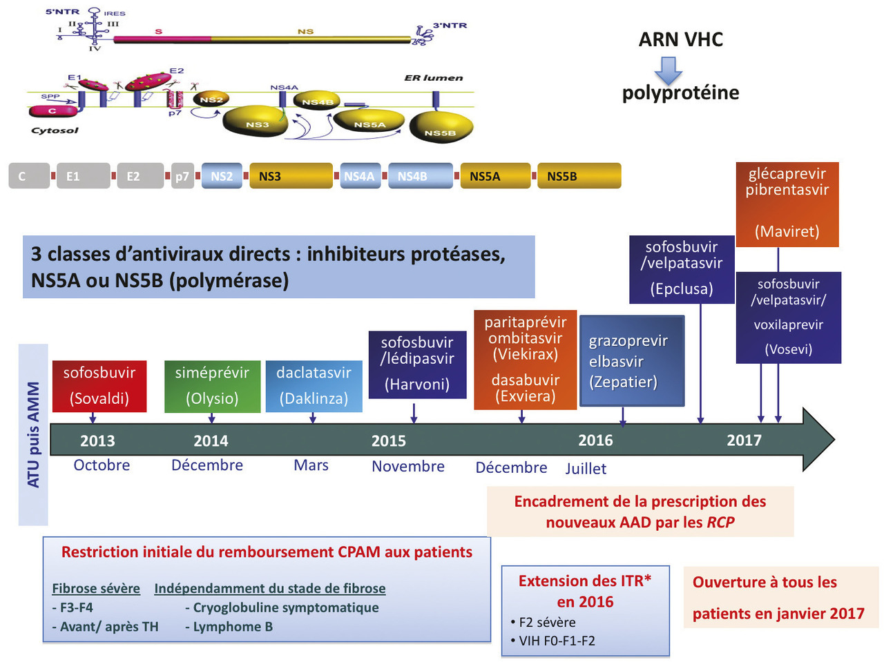 Le virus de l’hépatite C (VHC) est à l’origine d’hépatites aiguës spontanément résolutives dans un tiers des cas et a été identifié en 1988 comme étant un virus à ARN responsable de la majorité des hépatites « non A, non B » à transmission parentérale. Le taux élevé de passage à la chronicité de l’infection virale C de 70 % explique qu’environ 71 millions d’individus dans le monde ont une infection chronique par le VHC.1 Ce virus est, au moins dans les pays industrialisés, l’une des causes principales de transplantation hépatique et de carcinome hépatocellulaire, dont l’augmentation est prévue jusqu’à environ 2030.2, 3 La véritable révolution thérapeutique à laquelle on assiste aujourd’hui est unique par la rapidité de développement de nouveaux traitements (constamment plus efficaces et mieux tolérés), par l’agrément des agences d’enregistrement pour la mise sur le marché de molécules testées sans groupe contrôle et parfois sur un nombre limité de patients, ou par la discussion sur les prix avec le Comité économique des produits de santé. Le caractère unique actuel est aussi que, d’une part, l’infection par le VHC est la seule infection chronique dont on puisse espérer guérir et que, d’autre part, le foie ayant une capacité unique de régénération, la fibrose est en permanence remodelée par des enzymes hépatiques, ce qui permet d’observer sa régression, en l’absence de comorbidité hépatique, si l’activité nécrotico-inflammatoire est modeste ou absente. Cette réparation partielle (ou complète) s’observe aussi pour les manifestations extrahépatiques. Ces progrès thérapeutiques invitent à un dépistage élargi, voire universel4, pour un accès plus large aux traitements les plus efficaces, dans la perspective d’une élimination de l’infection par le VHC.