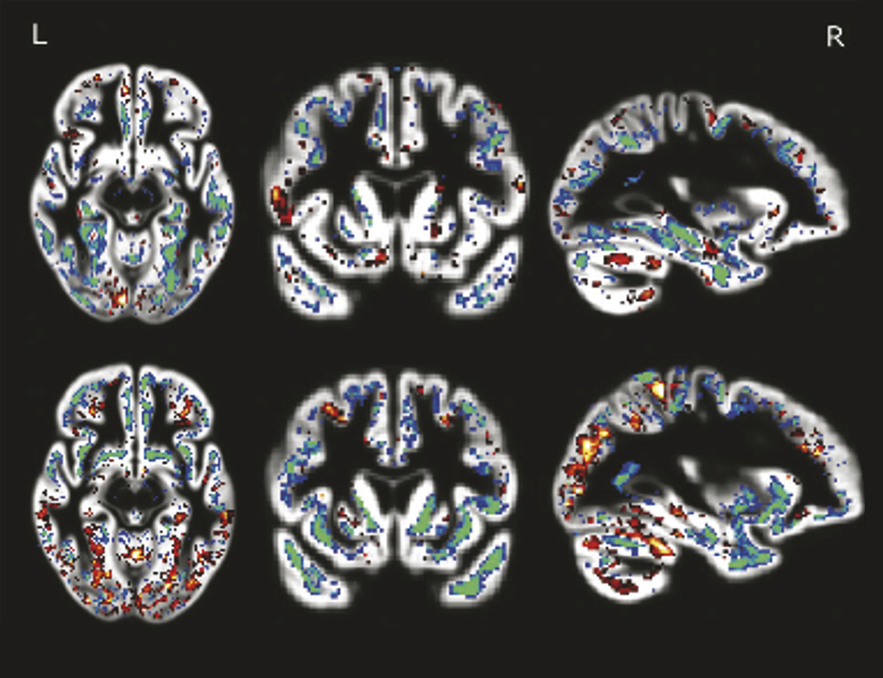 L’IRM fournit-elle un biomarqueur anatomique non invasif précis pour diagnostiquer les individus sans les hospitaliser ? L’analyse visuelle ne peut certainement pas le faire ; aucun radiologue, même expérimenté, ne diagnostique la maladie d’Alzheimer à partir d’une IRM clinique. De nombreuses études comparant les cohortes de patients et de témoins par IRM (structurelles et fonctionnelles) montraient différents profils d’atrophie cérébrale associés à des démences dégénératives.4 Jusqu’à présent, les analyses d’images d’individus n’ont pas été suffisamment sensibles pour identifier ces profils d’atrophie. De nombreux progrès dans la collecte des IRM sensibles aux différentes caractéristiques de tissus cérébraux sont en cours de développement ; il faut donc espérer qu’une association de profils IRM permettra une telle identification individuelle dans l’avenir.