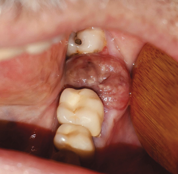 Ce patient de 60 ans consultait pour une lésion gingivale apparue il y a 1 semaine au niveau de l’alvéole de la 2e molaire mandibulaire gauche (37) extraite 1 mois auparavant. L’anamnèse notait un lupus traité par prednisone et hydroxychloroquine, une ostéoporose traitée par acide alendronique arrêté depuis 4 ans et une thrombocytopénie non étiquetée, à 100 000 plaquettes, connue depuis plusieurs années, sans altération de l’état général ni intoxication alcoolo-tabagique. À l’examen clinique endo-buccal (v. figure ), on notait une lésion muqueuse centrée sur l’alvéole d’avulsion de 37, bourgeonnante, sessile, saignant au contact, avec une muqueuse de recouvrement brunâtre et inhomogène ; pas d’adénopathie cervicale ni de lésion osseuse sur la radiographie panoramique. Le diagnostic évoqué était celui de botryomycome (lésion inflammatoire bénigne). L’analyse anatomopathologique de la biopsie-exérèse montrait un chorion infiltré par une prolifération en nappes de grandes cellules basophiles aux noyaux volumineux ainsi que de nombreuses mitoses et corps apoptotiques en aspect de « ciel étoilé » concluant à la localisation d’un lymphome plasmoblastique positif au virus d’Epstein-Barr. Le patient était alors adressé en hématologie pour la suite de prise en charge.