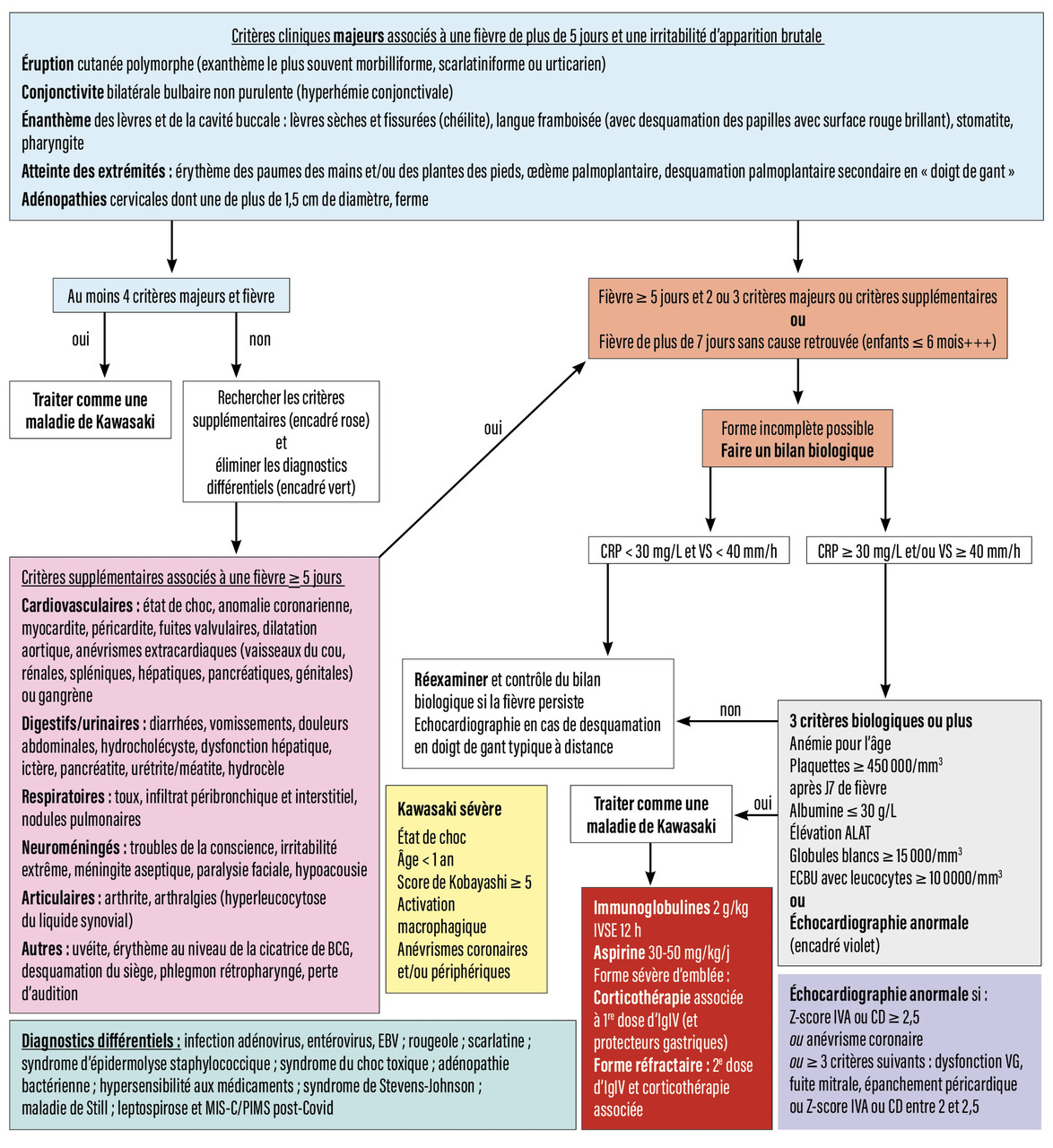 Récemment, des critères de forme sévère d’emblée ont été définis, et leur objectivation impose une prise en charge dans un centre expert pour une intensification thérapeutique d’emblée par IgIV et corticothérapie associée. Ces critères sont : un âge inférieur à 1 an, la présence d’un état de choc (Kawasaki disease shock syndrome), un score de Kobayashi supérieur ou égal à 5 (score prédictif de non-réponse aux IgIV), un syndrome d’activation macrophagique et/ou des anévrismes coronaires et/ou périphériques (fig. 2, encadré jaune ).7