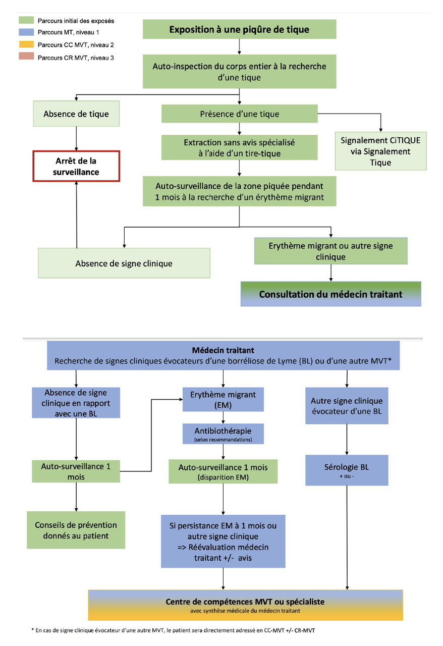 Attention : les sérologies de Lyme (y compris les autotests disponibles en vente libre) et l’antibioprophylaxie prophylactique ne sont pas recommandées après une piqûre de tique (balance bénéfice/risque défavorable).