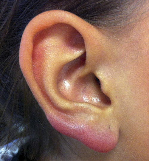 Autre manifestation cutanée, le lymphocytome borrélien (fig. 2) est une lésion unique, le plus souvent nodulaire ou en plaque, de couleur rouge ou violacée, +/- douloureuse, +/- prurigineuse, située sur le lobe de l’oreille, l’aréole mammaire, le scrotum, et plus rarement sur le tronc, le visage ou les membres.