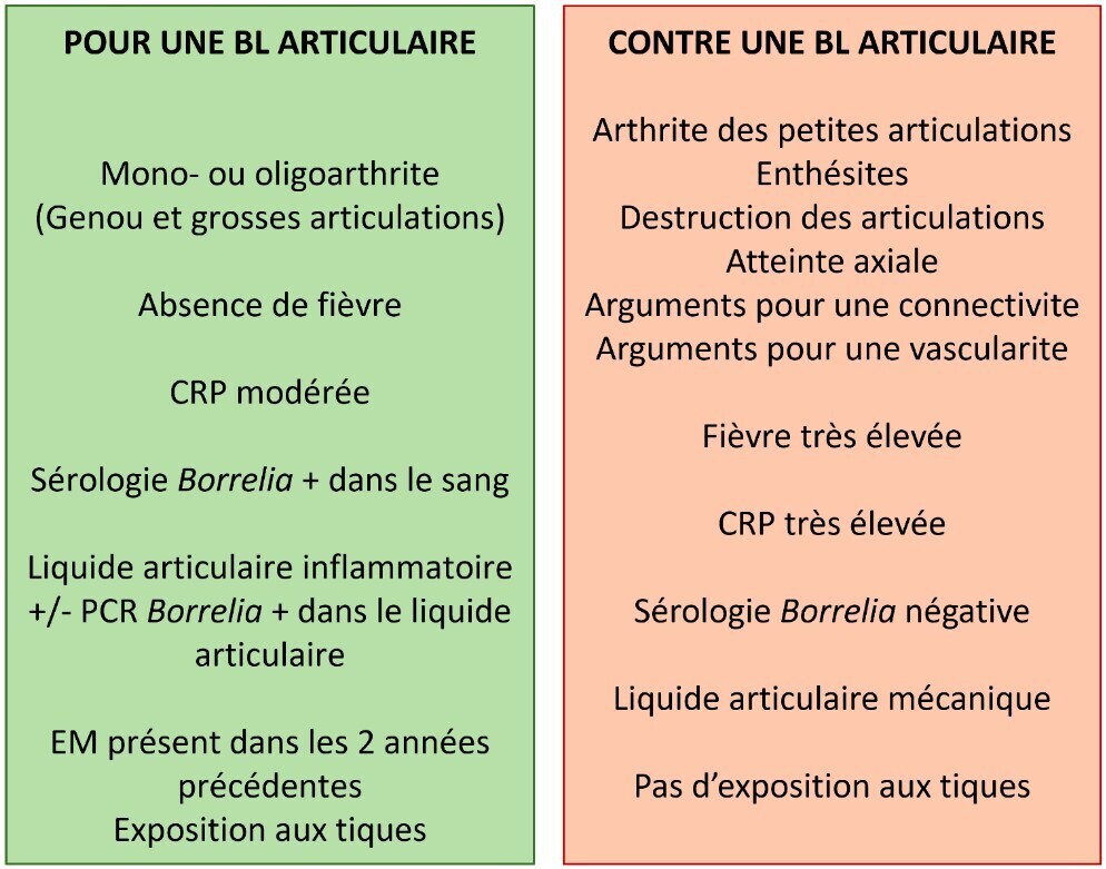 À savoir : chez un patient avec une PFP, le caractère bilatéral (dit « à bascule ») est très évocateur de borréliose de Lyme, d’autant plus si des douleurs radiculaires et/ou des céphalées et/ou d’autres symptômes inhabituels y sont associés (et s’il existe un antécédent de piqûre de tiques ou d’exposition aux tiques dans les 3 mois). Un algorithme décisionnel pour le diagnostic d’une PFP de Lyme est indiqué en figure 4. Les éléments cliniques et biologiques orientant vers une arthrite de Lyme sont indiqués dans la figure 5.