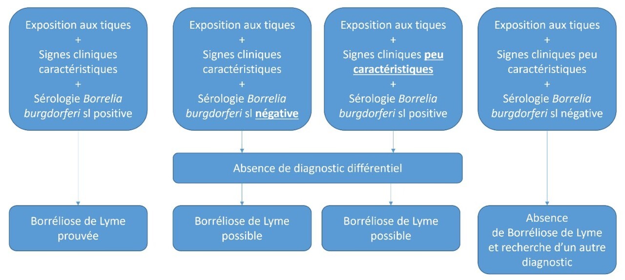 Pour les borrélioses disséminées, des examens complémentaires sont nécessaires pour confirmer le diagnostic (analyse du LCS avec cytologie et sérologie pour les neuroborrélioses ou analyse du liquide articulaire avec cytologie et PCR pour les arthrites de Lyme, etc.). Dans les cas complexes, où au moins une condition du trépied diagnostique ne serait pas remplie, il faut rechercher des diagnostics différentiels par des examens complémentaires et le patient peut être adressé en centre expert.