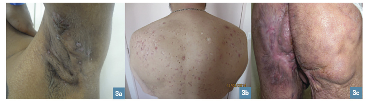 Les lésions précoces sont des nodules douloureux isolés pouvant s’abcéder (fig. 1 ). La répétition de poussées inflammatoires est responsable de cicatrices hypertrophiques et fibreuses en pont, de trajets fistuleux et de comédons ouverts (fig. 2 ). Lésions non typiques : folliculite, bourgeons charnus, cicatrices vermoulues ou à l’emporte-pièce, kystes épidermiques. Pas d’adénopathie ni de fièvre associée.