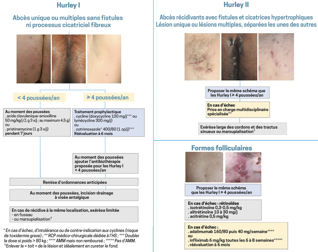 Fin 2019, le centre de preuves de la Société francaise de dermatologie a émis des recommandations ; fig. 7 ). Pour tous les patients : prise en charge de la douleur et psychologique, perte de poids, arrêt du tabac.