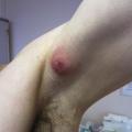 – « folliculaire » ou LC2 (26 %) : touchant les régions axillaires, mammaires, rétro-auriculaires, thoracique, dorsale ; les probabilités de manifestations folliculaires (kystes épidermiques, comédons, sinus pilonidal) sont élevées. Cette forme sévère est plus fréquente chez les fumeurs. Une atteinte pré- et rétro-auriculaire avec des lésions à type de poche et des cicatrices vermoulues du visage doivent faire suspecter le diagnostic ;