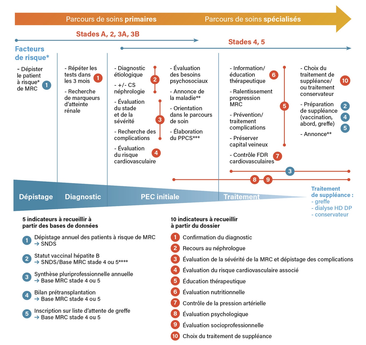 3. HAS. Parcours du patient adulte présentant une maladie rénale chronique. Définition des indicateurs de qualité du parcours de soins. Septembre 2021. https://www.has-sante.fr/jcms/p_3288950/fr/guide-du-parcours-de-soins-maladie-renale-chronique-de-l-adulte-mrc