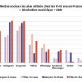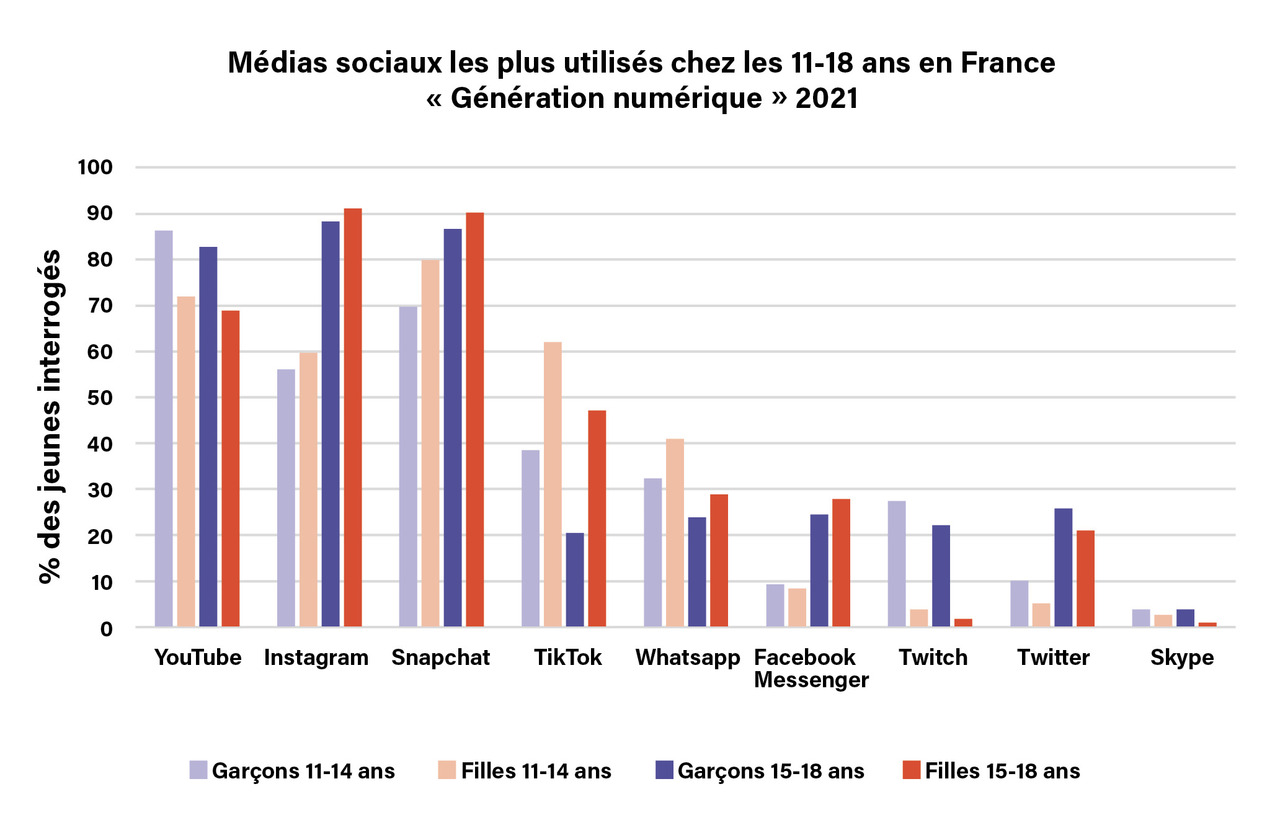 Selon une enquête de Génération numérique menée en 2020 et portant sur les pratiques numériques des jeunes de 11 à 18 ans, les médias sociaux les plus utilisés par les adolescents sont Instagram, Snapchat et YouTube (