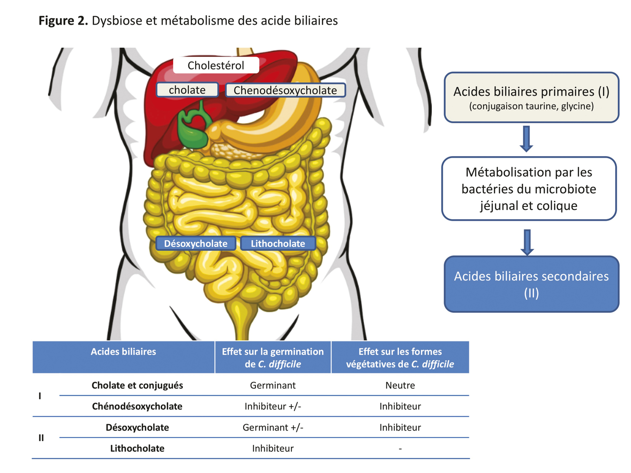 Un rôle important du microbiote intestinal est de pouvoir réguler les acides biliaires primaires et secondaires afin d’inhiber la croissance de C. difficile. On sait depuis des décennies que le taurocholate est un composé qui permet d’induire la germination des spores ; il est habituellement utilisé dans les milieux de culture sélectifs afin de favoriser l’isolement de C. difficile.27 Plus tard, il a été montré que les dérivés de l’acide cholique conjugués à la glycine ou à la taurine activent la germination tandis que les dérivés des acides biliaires secondaires comme le désoxycholate inhibent la germination.28-30 Un traitement antibiotique peut favoriser la croissance de C. difficile en modifiant le métabolisme des acides biliaires (augmentation des acides biliaires germinants et inhibition des acides biliaires inhibant les formes végétatives) [
