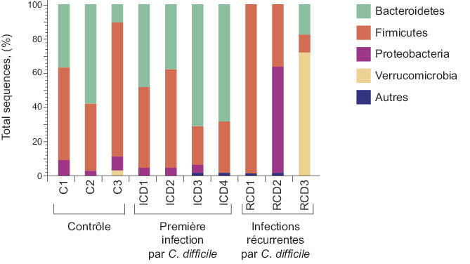 De nombreuses études ont montré une diminution de la richesse et de la diversité microbienne intestinale chez les patients atteints d’infection à C. difficile ou de récidives par rapport à des patients porteurs asymptomatiques de C. difficile ou des témoins négatifs.18-21 Cette dysbiose est habituellement caractérisée par une diminution des Bacteroides, Bifidobacterium et bactéries productrices de butyrate (Ruminococcaceae, Lachnospiraceae) et une augmentation des γ-Proteobacteria (entérobacteries) et Enterococcus. L’analyse à l’aide d’un modèle de régression logistique du microbiote intestinal de 338 patients a révélé que les selles des patients infectés par C. difficile étaient enrichies en espèces appartenant aux Enterococcaceae, Enterobacteriaceae, Erysipelotrichaceae et Lachnospiraceae et déplétées en certaines espèces appartenant aux Ruminococcaceae, Porphyromonadaceae, Lachnospiraceae et Bacteroides par rapport aux contrôles sains ou aux patients diarrhéiques sans infection à C. difficile.22 D’autres études ont montré une déplétion en certaines espèces bactériennes telle la famille des Clostridiales incertae Sedis XI chez les patients qui développent une infection à C. difficile comparés à des témoins.23 Une équipe24 a comparé le microbiote de 14 enfants âgés de 28 à 48 mois à celui de 43 témoins sains appariés sur l’âge. Comme chez l’adulte, ils ont montré une diversité microbienne significativement inférieure chez les enfants infectés comparé aux témoins. Une augmentation du ratio Firmicutes/Bacteroidetes a été mise en évidence chez les enfants infectés avec une diminution des bactéries productrices de butyrate (Ruminococcaceae incluant Faecalibacterium, Lachnospiraceae et Porphyromonadaceae) et une augmentation des Enterococcaceae, Streptococcaceae, Lactobacillaceae, Actinomycetaceae produisant du lactate.