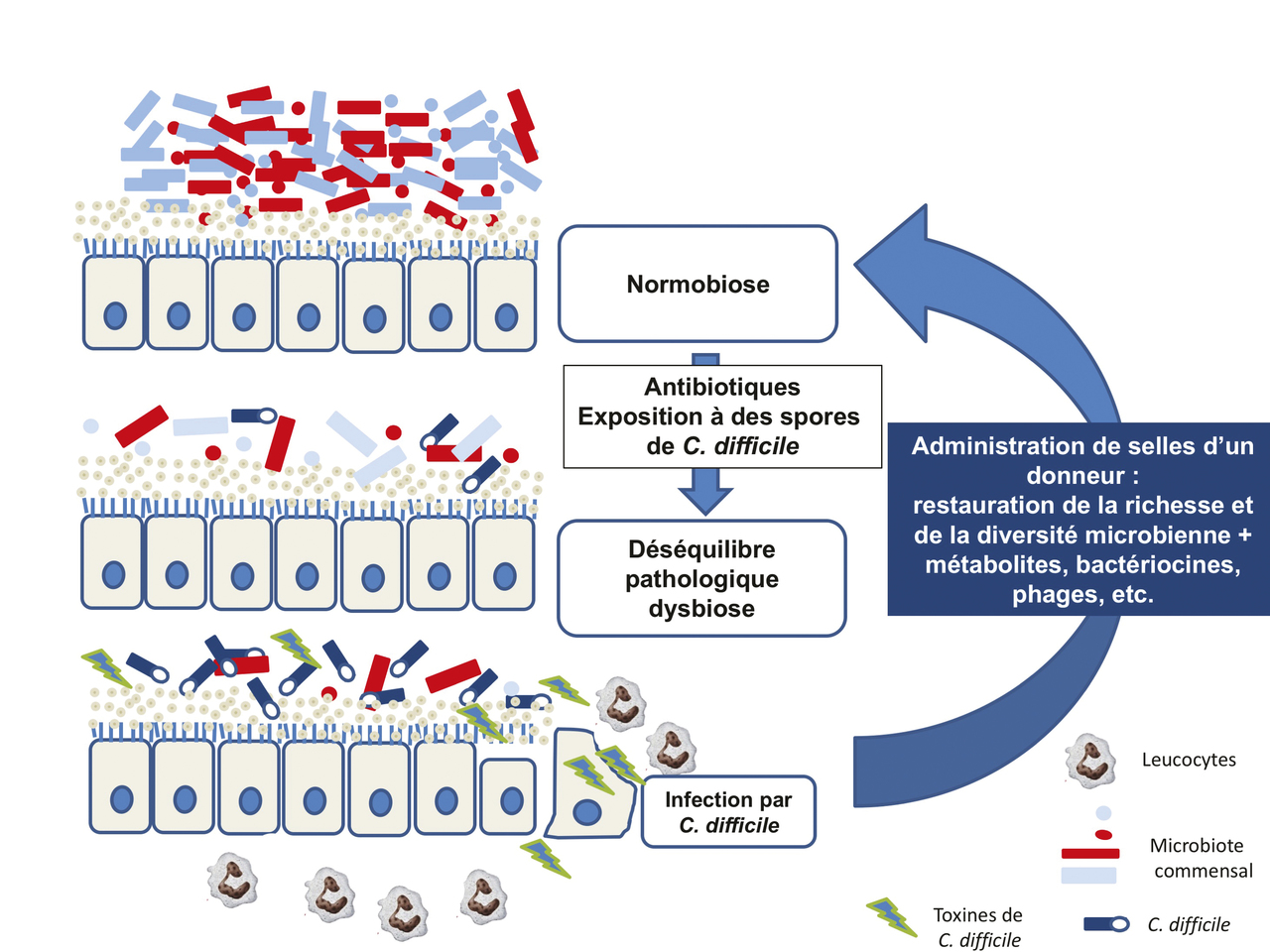 Les avancées technologiques (séquençage haut débit ARN 16S, métagénomique, métabolomique) ont permis des progrès notables dans la connaissance de la structure des communautés bactériennes intestinales et la compréhension de la résistance à la colonisation par C. difficile. La restauration de la diversité microbienne par transplantation de microbiote fécal a connu ces dernières années un essor considérable dans le traitement des récidives multiples d’infection à C. difficile. D’autres approches de « biothérapies », moins à risque que la transplantation fécale, sont à l’étude.