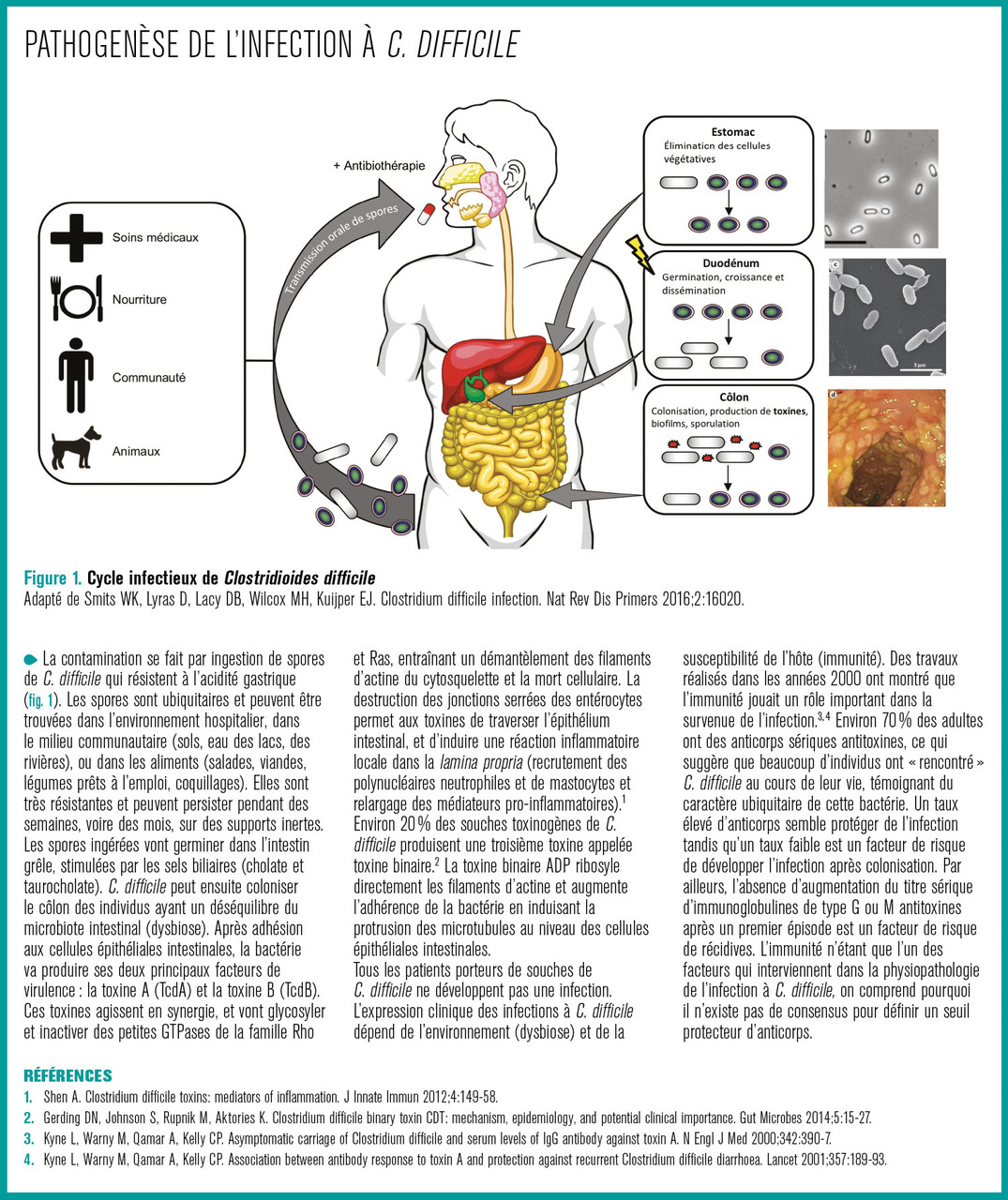 Clostridioides difficile (anciennement appelé Clostridium difficile)1 est une bactérie anaérobie à Gram positif sporulée toxinogène. Depuis la découverte de son rôle dans les colites pseudomembraneuses post-antibiotiques à la fin des années 1970, C. difficile est devenue un entéropathogène majeur, responsable de 15 à 25 % des cas de diarrhées post-antibiotiques et de 95 % des cas de colite pseudomembraneuse.2, 3 Cette bactérie est considérée aujourd’hui non seulement comme le principal agent des diarrhées associées aux soins chez l’adulte4 mais aussi comme un pathogène fréquemment impliqué dans les diarrhées d’origine communautaire.5