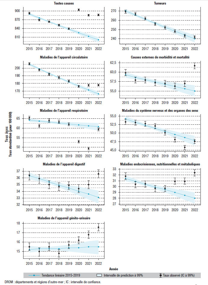 Ces hausses pourraient être liées à des effets induits par la pandémie et qui perdurent (retard de prise en charge, difficultés d’accès aux soins, changements dans les comportements, voire dans l’offre de soins).