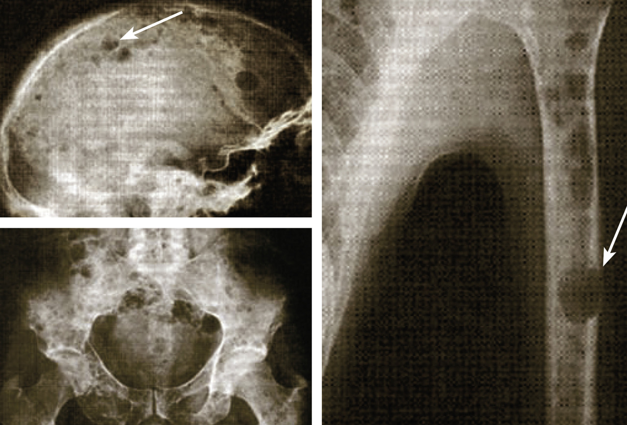 Elle est présente dans 70 % des cas au diagnostic mais peut aussi survenir en cours d’évolution. Les douleurs osseuses intéressent habituellement le squelette axial (rachis, côtes, bassin). D’aggravation progressive, elles nécessitent le recours aux antalgiques majeurs et ont un retentissement fonctionnel pouvant confiner le patient au lit. Les tuméfactions des os plats (crâne, sternum) et les fractures pathologiques révélatrices sont moins fréquentes. La maladie osseuse du myélome est en rapport avec un découplage du remodelage osseux : le recrutement et l’hyperactivité des cellules ostéoclastiques, sous l’influence de l’IL- 6, produite par le micro-environnement médullaire et les plasmocytes tumoraux eux-mêmes, entraînent une augmentation de la destruction osseuse par hyperexpression du RANK-L se liant au RANK (récepteur activateur de la voie Nf-kB appartenant à la superfamille des TNF), alors que l’ostéoprotégérine (OPG), qui bloque le RANK, est diminuée avec augmentation du rapport RANK-L/OPG. Les cellules ostéoblastiques sont au contraire déprimées, par blocage de la voie Wnt/DKK1 responsable de la maturation des ostéoblastes, avec une balance négative de l’ostéoformation par rapport à l’ostéolyse.