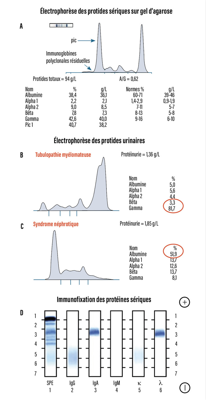 L’immunoglobuline monoclonale est suspectée sur la présence d’une bande étroite migrant dans les gammaglobulines ou, moins souvent, dans la région des bêtaglobulines, sur l’électrophorèse des protides sériques (EPS) ou urinaires (EPU) (fig. 2A). L’électrophorèse des protides sériques ou urinaires permet, par intégration du pic (aire sous la courbe), d’estimer la quantité d’immunoglobuline monoclonale. Seules l’immunofixation (IF) ou l’immuno-électrophorèse (IEP) permettent d’identifier l’immunoglobuline monoclonale en déterminant sa chaîne lourde (IgG dans 60 % des cas ou IgA dans 20 % des cas) et sa chaîne légère (kappa ou lambda) [fig. 2B]. Parfois, l’électrophorèse des protides sériques ne montre pas de pic mais une hypogammaglobulinémie (15 à 20 % des myélomes) : il faut alors savoir rechercher la présence de chaînes légères isolées kappa (deux tiers des cas) ou lambda (un tiers des cas), dans le sang ou dans les urines, par immunofixation ou immuno-électrophorèse. La présence de chaînes légères dans les urines correspond à ce que l’on nommait protéinurie de Bence-Jones, détectée par des méthodes de précipitation à chaud à l’acide sulfosalicylique. Dans moins de 1 % des cas, aucune immunoglobuline monoclonale n’est détectée : il s’agit d’un myélome non sécrétant ou non excrétant. Le diagnostic est évoqué devant une hypogammaglobulinémie à l’électrophorèse des protides sériques et confirmé par la plasmocytose médullaire associée à un critère CRAB (v. infra).