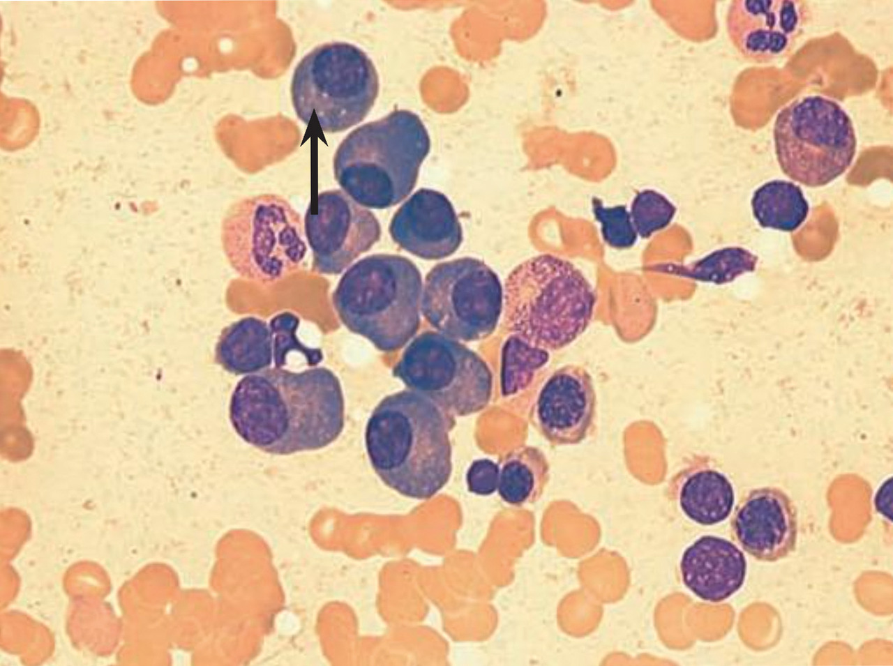 L’anémie est très fréquente au cours du myélome et souvent révélatrice. Elle est due à l’envahissement médullaire mais aussi à une action spécifique des plasmocytes tumoraux qui stimulent l’apoptose des érythroblastes médullaires par la voie du ligand Fas. Elle peut être faussement majorée par l’hémodilution liée à l’hyperprotidémie. Elle se manifeste par une asthénie d’aggravation progressive, une pâleur et une dyspnée d’effort. Le frottis sanguin montre le phénomène caractéristique des rouleaux avec empilement des hématies en pile d’assiettes lié à l’agrégation de l’immunoglobuline monoclonale adsorbée à leur surface. La neutropénie et la thrombopénie sont beaucoup plus rares au diagnostic et surviennent plutôt en cours de traitement.